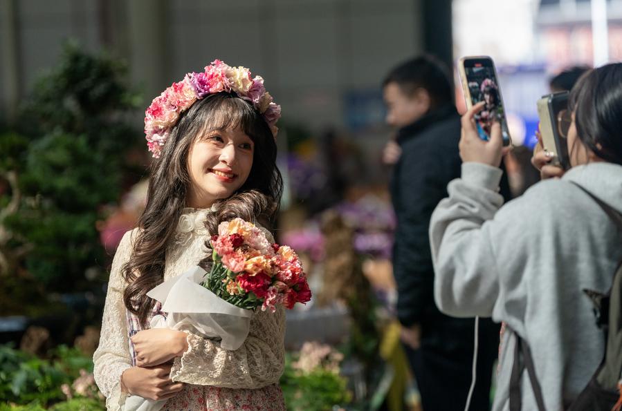 22 января 2025 года, туристка фотографируется на цветочном рынке Доунань города Куньмин провинции Юньнань /Юго-Западный Китай/. /Фото: Синьхуа/