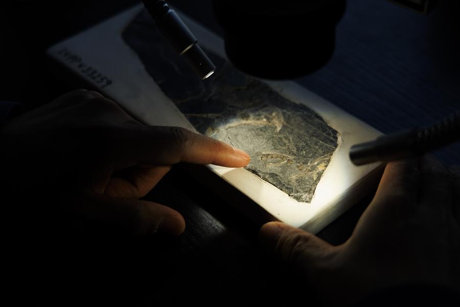 10 февраля 2025 года, научный сотрудник ИППП при АНК Ван Минь исследует образец окаменелости птицы Baminornis zhenghensis в своем офисе в Пекине. /Фото: Синьхуа/