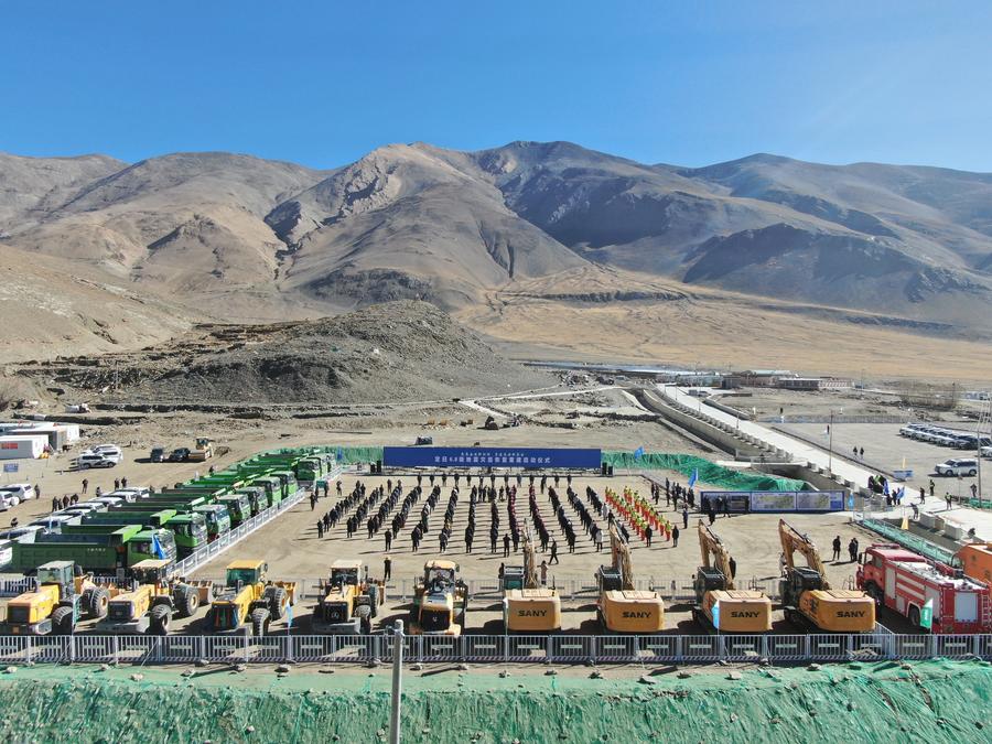3 марта 2025 года, на фотографии, сделанной с беспилотника, запечатлена сцена церемонии начала восстановительных работ в восьми пострадавших в результате землетрясения деревнях в уезде Тингри /Сицзанский автономный район, Юго-Западный Китай/. /Фото: Синьхуа/