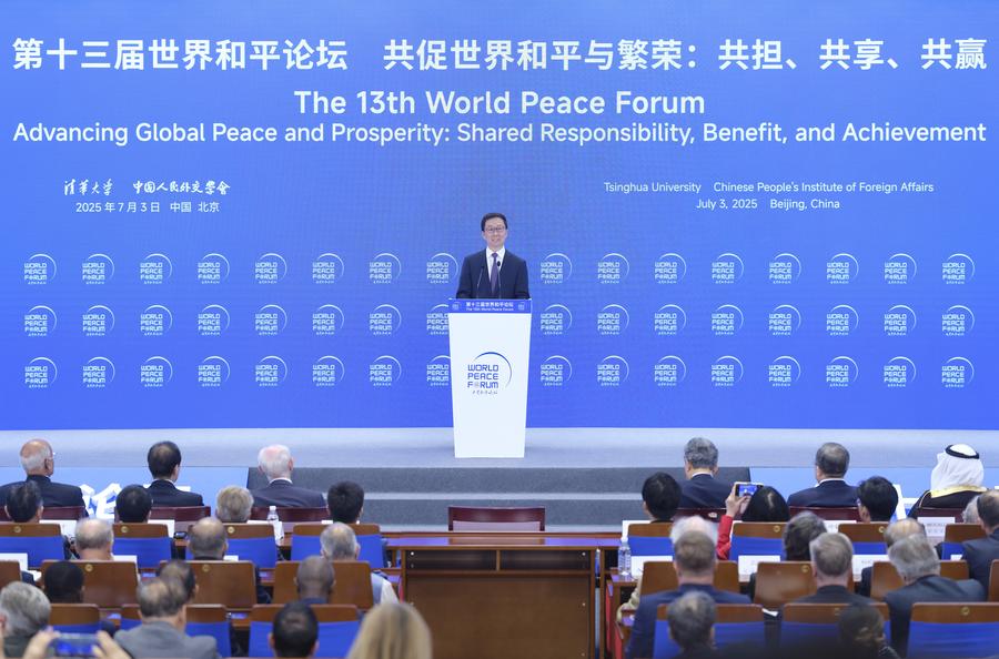 Пекин, 3 июля /Синьхуа/ -- Заместитель председателя КНР Хань Чжэн в четверг выступил на церемонии открытия 13-го Всемирного форума мира в Пекине, призвав к совместной защите международной честности и справедливости и совершенствованию системы глобального управления.