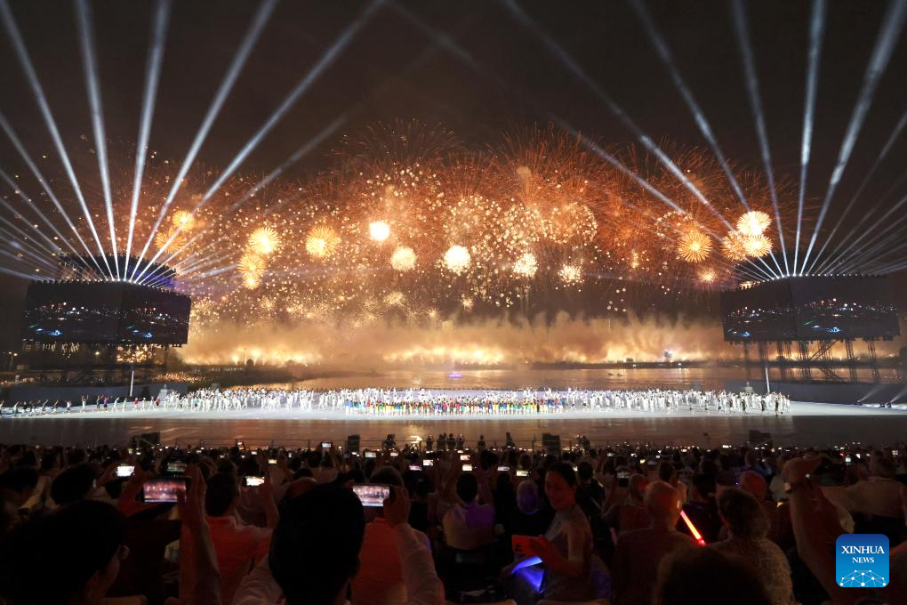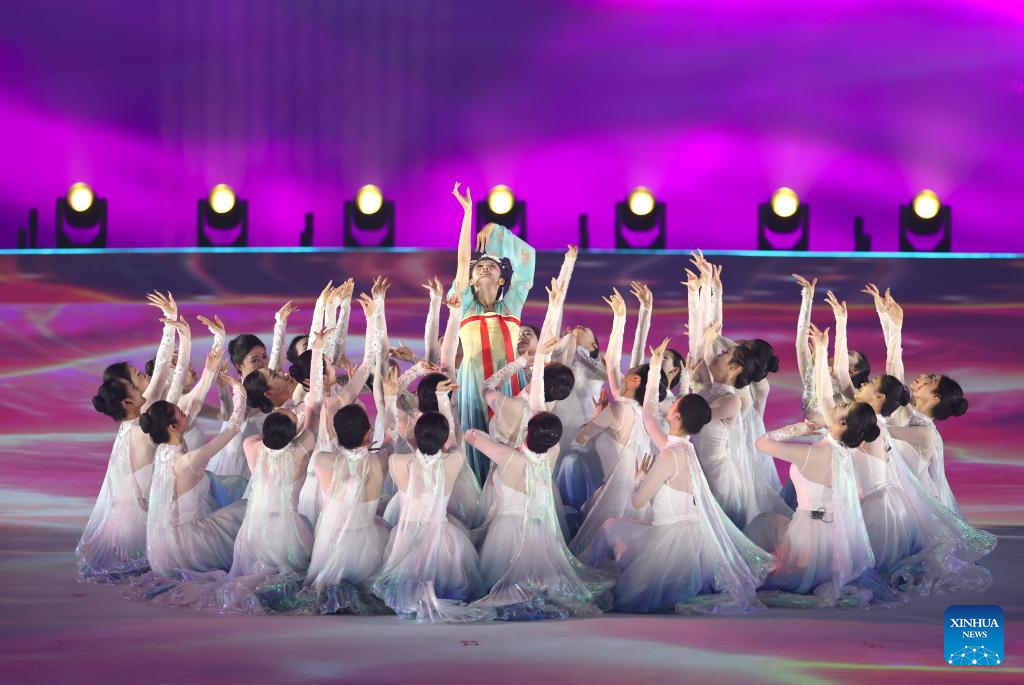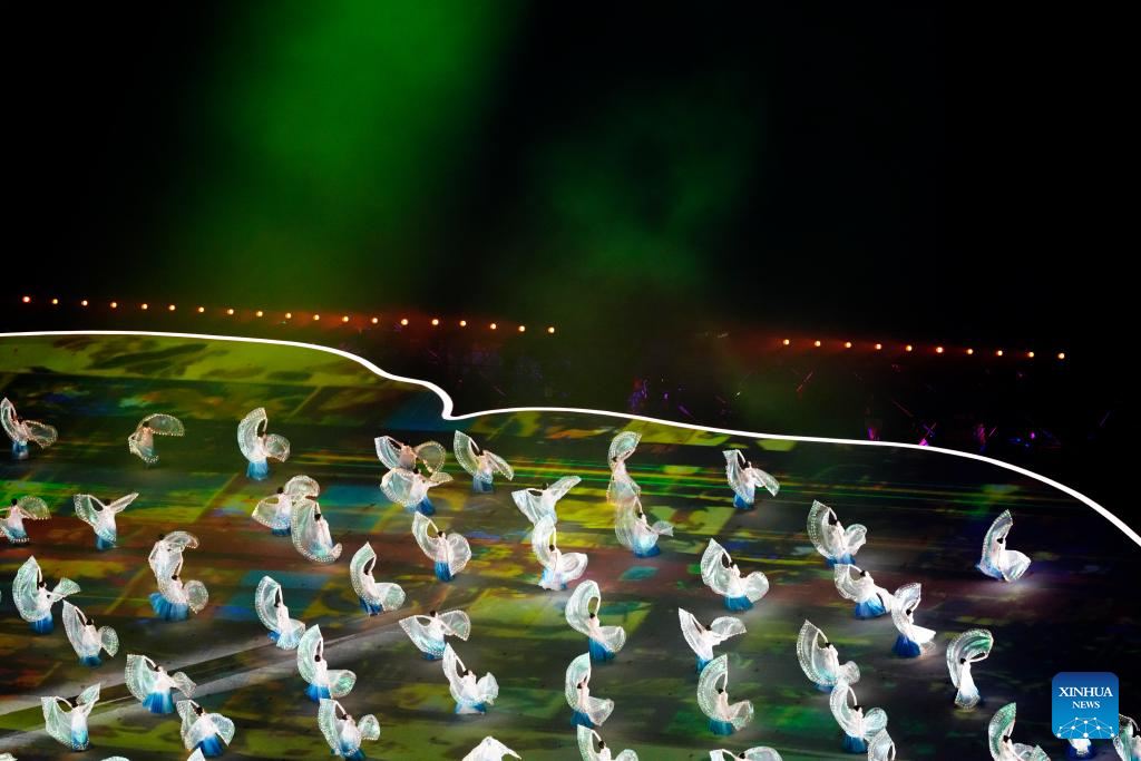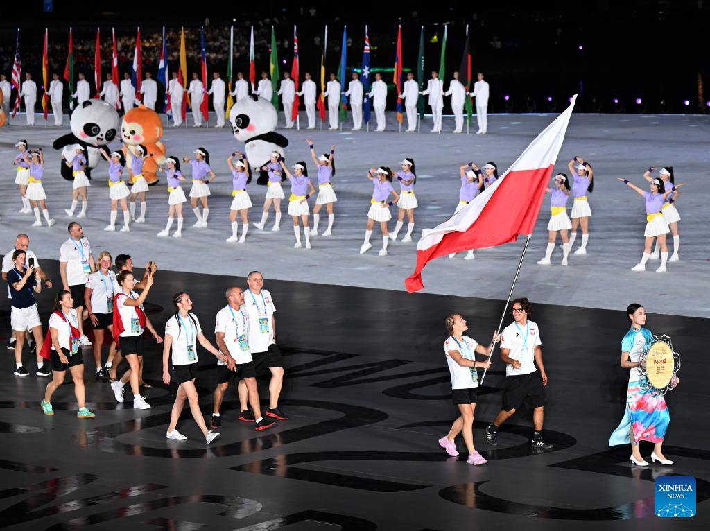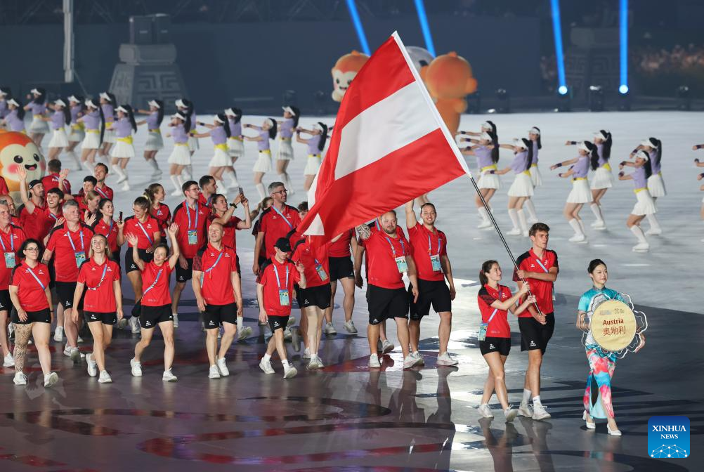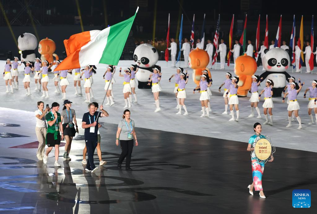 Под "крышей Тяньфу" -- крупнейшей в Азии единой деревянной конструкцией, простирающейся на 430 метров, -- около 10 тыс. зрителей приветствовали бурными аплодисментами Шэнь Ицинь, которая официально объявила Игры открытыми. На церемонии также присутствовали президент Международной ассоциации Всемирных игр /IWGA/ Хосе Перурена и член исполнительного комитета Международного олимпийского комитета /МОК/ Ли Линвэй.