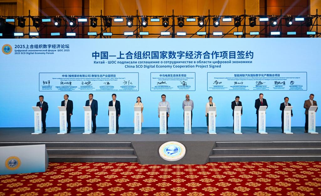 11 июля, Тяньцзинь, Китай. Подписание соглашения о сотрудничестве в области цифровой экономики между Китаем и странами ШОС на Форуме ШОС по цифровой экономике 2025 года. /Фото: Синьхуа/