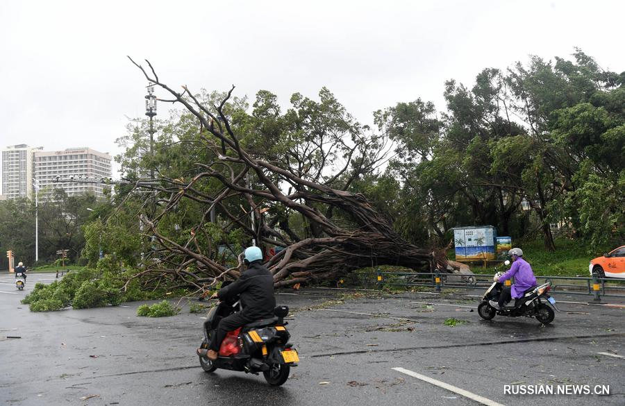 25 августа 2025 года, горожане проезжают перед поваленными деревьями в районе Цзиян города Санья пров. Хайнань /Южный Китай/. /Фото: Синьхуа/