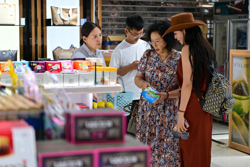26 июля 2024 года, туристы выбирают товары в одном из беспошлинных магазинов Китайско-казахстанского международного центра приграничного сотрудничества "Хоргос" в Синьцзян-Уйгурском автономном районе /Северо-Западный Китай/. /Фото: Синьхуа/