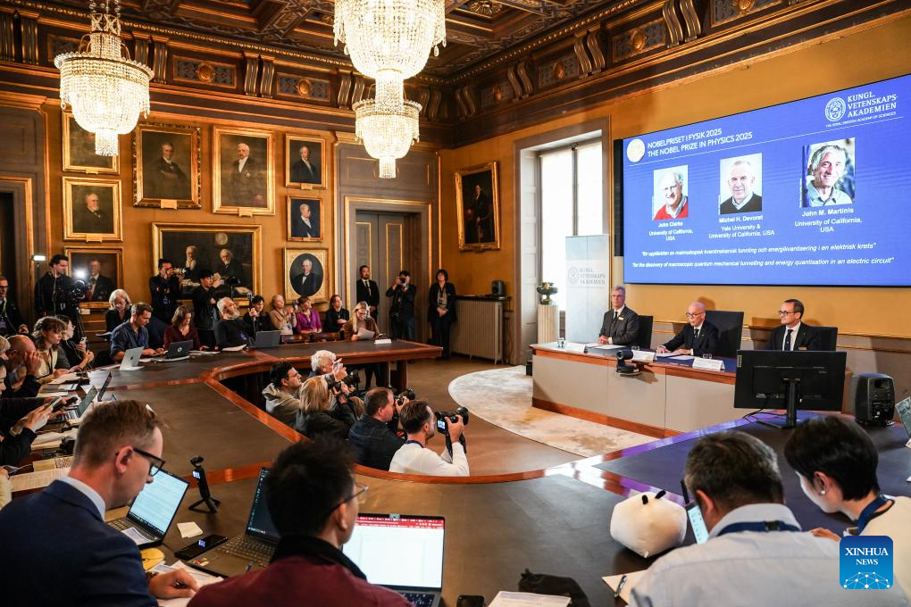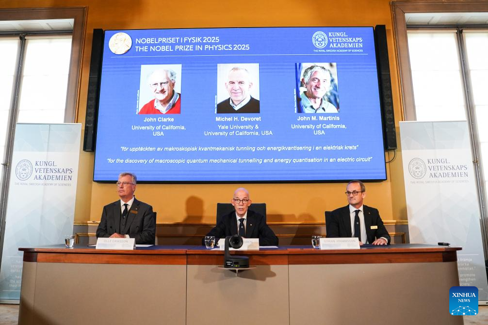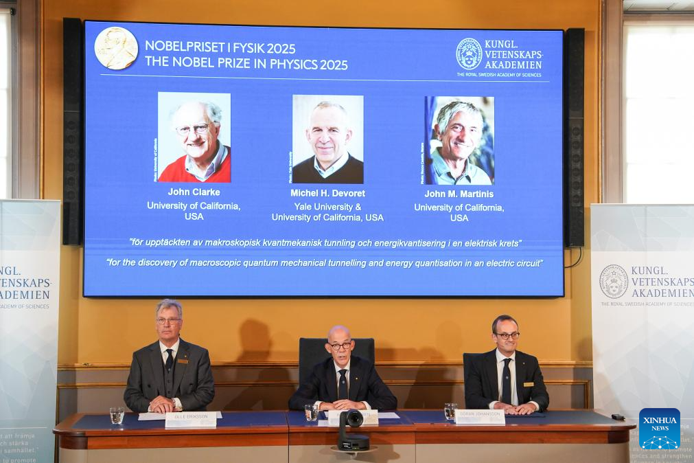 Стокгольм, 7 октября /Синьхуа/ -- Трое работающих в США ученых -- Джон Кларк, Мишель Деворе и Джон Мартинис -- были удостоены Нобелевской премии по физике 2025 года за открытие макроскопического квантово-механического туннелирования и квантования энергии в электрической цепи. Об этом во вторник сообщила Королевская академия наук Швеции.