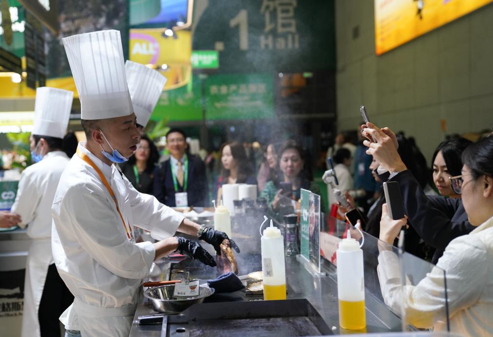 5 ноября 2025 года, сотрудники готовят еду для посетителей выставочной зоны сельскохозяйственной продукции и продуктов питания 8-го Китайского международного импортного ЭКСПО /CIIE/, которое проходит в городе Шанхай на востоке Китая. /Фото: Синьхуа/