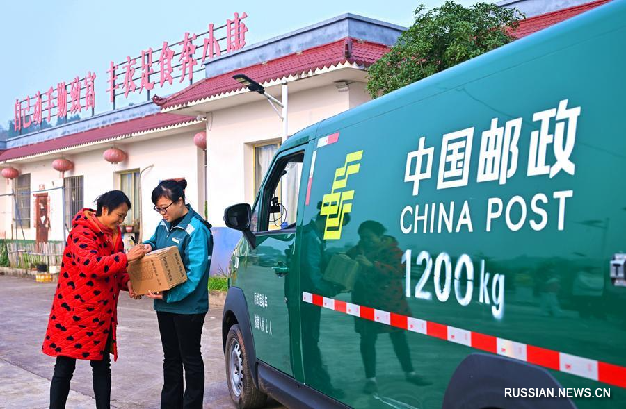1 декабря 2025 года, сотрудница Почты Китая вручает посылку получательнице в жилом комплексе Саньси поселка Чжуцзя города Мэйшань /пров. Сычуань, Юго-Западный Китай/. /Фото: Синьхуа/