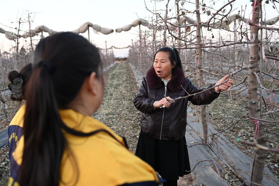 9 января 2025 года, во фруктовом саду в уезде Байшуй города Вэйнань /пров. Шэньси/ глава местного профильного кооператива по выращиванию яблок Линь Цюфан /справа/ обучает ключевым навыкам по обрезке яблонь. /Фото: Синьхуа/