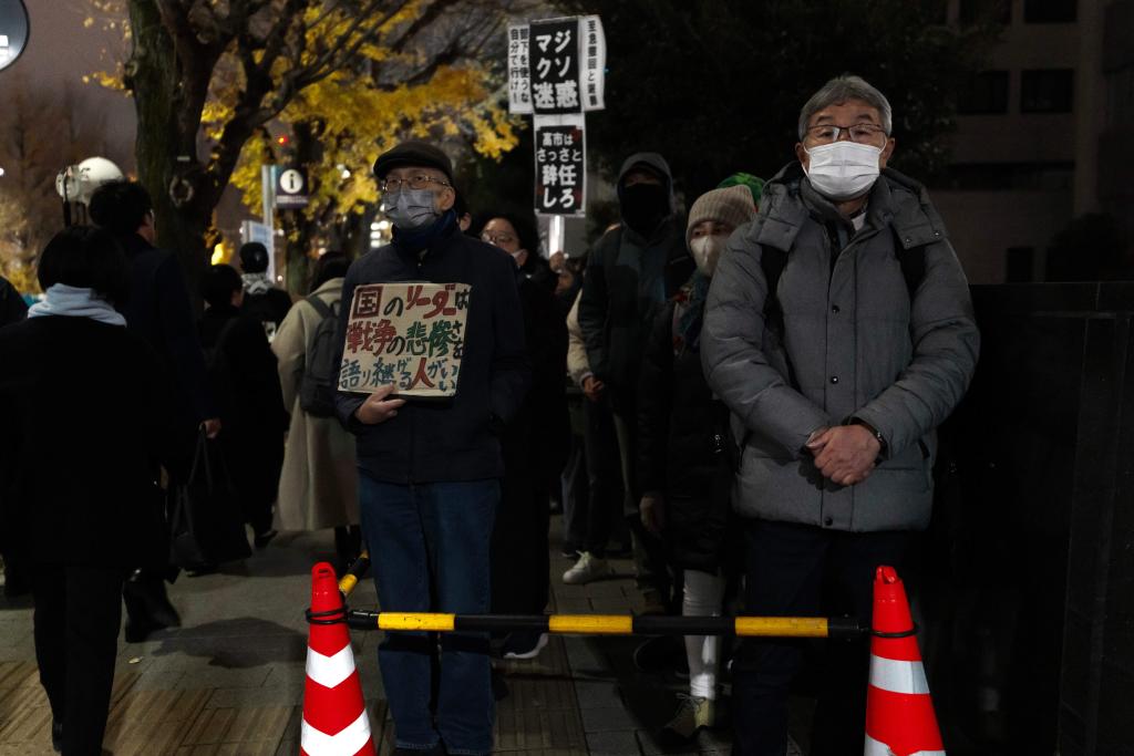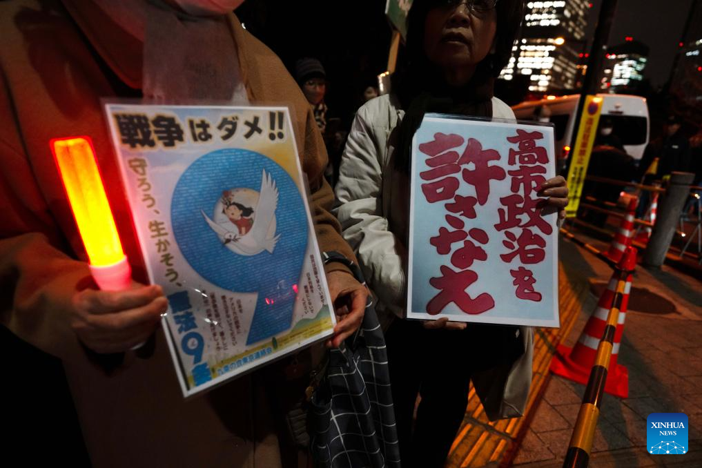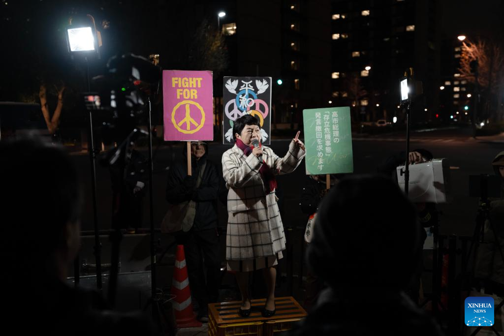 Токио, 24 декабря /Синьхуа/ -- Граждане Японии провели митинг во вторник вечером перед офисом главы правительства в Токио, требуя, чтобы премьер-министр Санаэ Такаити отказалась от своих ошибочных высказываний о Тайване, и критикуя комментарии высокопоставленного правительственного чиновника, выступающего за ядерное вооружение.