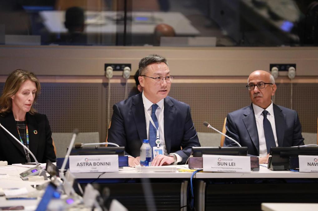 16 июля, Нью-Йорк. Заместитель постоянного представителя Китая при ООН Сунь Лэй /в центре/ выступает на мероприятии "Презентация сборника кейсов лучших практик глобального устойчивого транспорта за 2025 год" в штаб-квартире ООН. /Фото: Синьхуа/