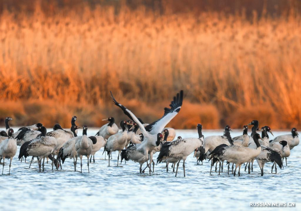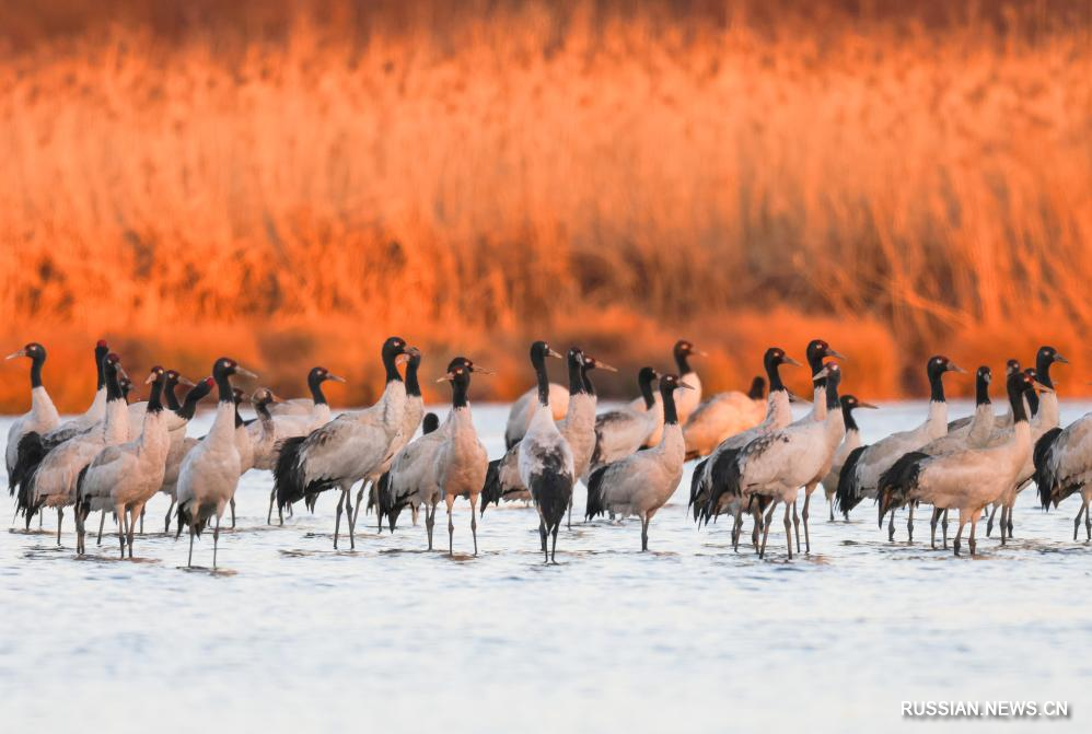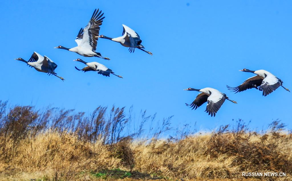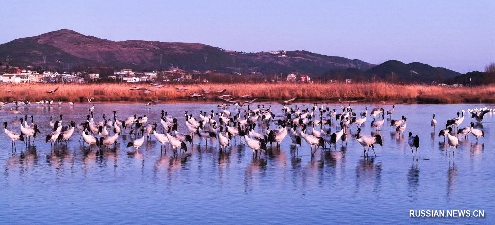 Вэйнин /пров. Гуйчжоу/, 31 января /Синьхуа/ -- Большие стаи перелетных птиц, таких как черношейные журавли, серые журавли и горные гуси, прилетели на зимовку в Национальный природный заповедник Цаохай, расположенный в уезде Вэйнин города Бицзе провинции Гуйчжоу /Юго-Западный Китай/.