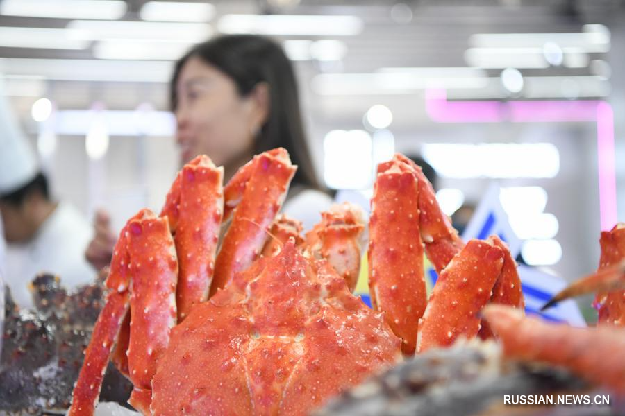 20 мая 2024 года, на снимке запечатлены камчатские крабы, представленные на 8-м Китайско-российском ЭКСПО в городе Харбин на северо-востоке Китая. /Фото: Синьхуа/