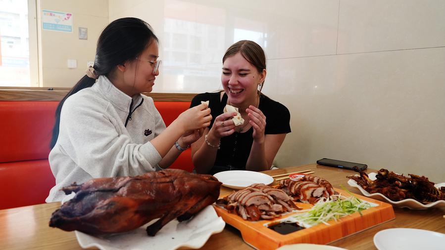 30 января 2026 года, девочки из Китая и России вместе едят пекинскую утку в рамках акции "Теплое сердце Китая -- у меня есть дом в Китае" в городе Маньчжоули автономного района Внутренняя Монголия /Северный Китай/. /Фото: Синьхуа/