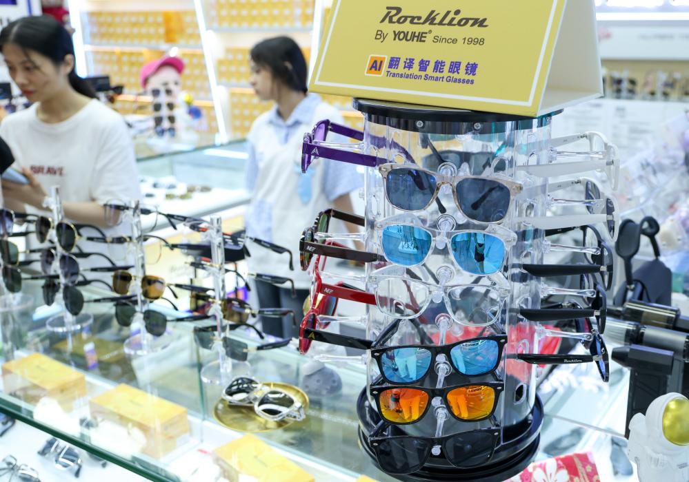 22 июля 2025 года, разнообразные смарт-очки, выложенные на прилавке-витрине на рынке электроники "Хуацянбэй" в городе Шэньчжэнь провинции Гуандун /Южный Китай/. /Фото: Синьхуа/