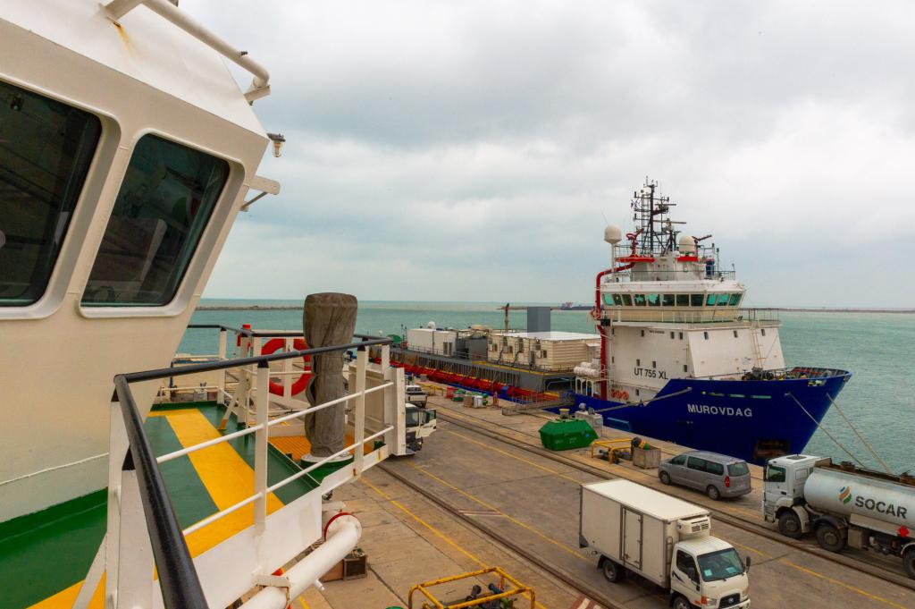 10 февраля, Баку. Судно-источник, принимающее участие в операции на море, пришвартовано у причала Бакинского судостроительного завода. /Фото: Синьхуа/