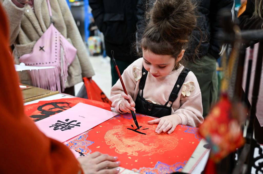 13 февраля 2026 года, девочка из Казахстана знакомится с китайской каллиграфией в международном аэропорту Алматы в Казахстане. /Фото: Синьхуа/
