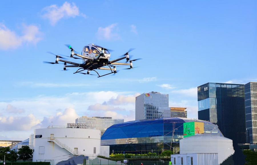 23 июля 2025 года, полет электрического летательного аппарата с возможностью вертикального взлета и посадки /eVTOL/ компании Guangzhou EHang Intelligent Technology над городом Шанхай /Восточный Китай/ во время проведения Международной выставки низковысотной экономики-2025. /Фото: Синьхуа/