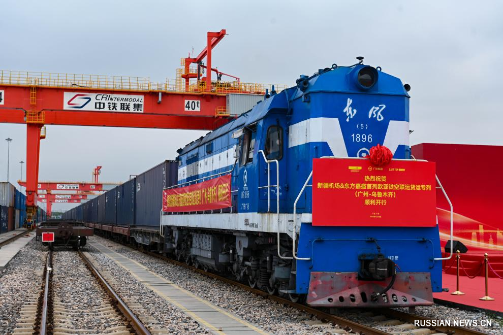 18 апреля 2025 года, специальный поезд, курсирующий по маршруту Гуанчжоу-Урумчи по модели мультимодальных транспортировок "железная дорога-воздух", в Гуанчжоуском международном порту. /Фото: Синьхуа/
