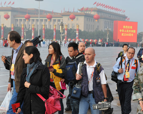 Отечественные и зарубежные журналисты собрались на площади Тяньаньмэнь для освещения торжеств в честь 60-летия образования КНР