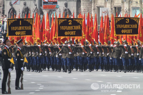 В параде приняла участие военная техника времен войны, в том числе танк Т-34. Следом прошли военные, одетые в военную форму времен Великой Отечественной. Всего в параде в Киеве приняли участие около 3 тысяч военнослужащих, в том числе - около 200 представителей России и Белоруссии.