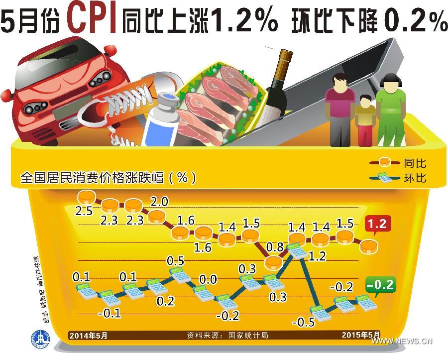 Пекин, 9 июня /Синьхуа/ -- В мае 2015 года индекс потребительских цен /CPI/ в Китае повысился на 1,2 проц по сравнению с показателем того же месяца 2014 года, амплитуда роста оказалась на 0,3 процентного пункта ниже, чем в апреле этого года. Такие данные обнародовало во вторник Государственное статистическое управление КНР.