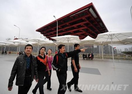 На фото: Используя короткое время отдыха в полдень, Кэюму (второй справа) с коллегами посетили Парк ЭКСПО (фотография снята 9 мая)