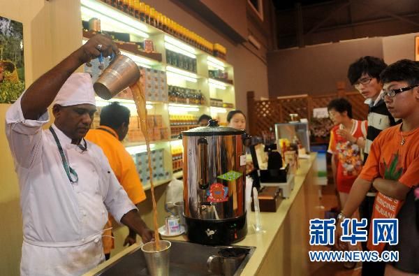 На фото: 20 июля, повар (первый слева) ресторана в национальном павильоне Шри-Ланки готовит чай с молоком.