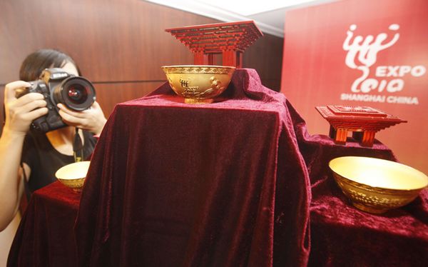 Пекин, 3 сентября / Синьхуанет/ -- 1 сентября в Шанхае, по ратификации Координационного бюро выставки ЭКСПО-2010, были выпущены золотые чашки, посвященные ЭКСПО-2010. Эти чашки будут продаваться в розничных магазинах официальных товаров ЭКСПО и пунктах Банка коммуникаций в ограниченном количестве. Чашки, посвященные ЭКСПО-2010 в Шанхае, изготовлены из золота 999 пробы посредством более 10 процедур в 5 видах. Диапазон цен - от 23880 до 198000 юаней.
