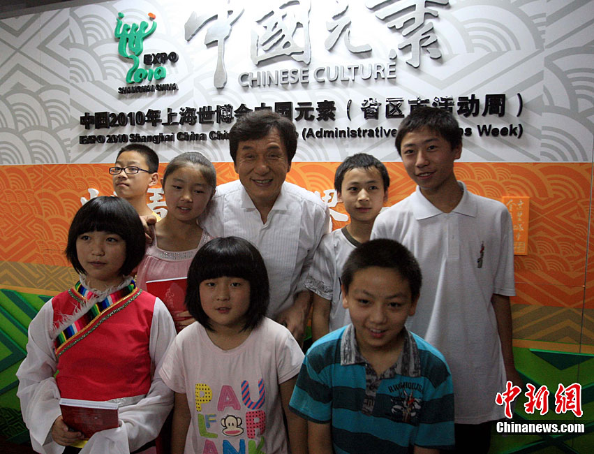 На фото: послол ЭКСПО-2010 в Шанхае, актер Джекки Чан сфотографировался с детьми из уезда Чжоуцюй провинции Ганьсу.