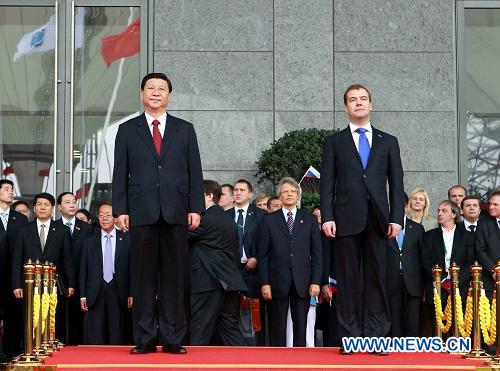 Шанхай, 28 сентября /Синьхуа/ -- Заместитель председателя КНР Си Цзиньпин и президент РФ Дмитрий Медведев сегодня здесь совместно присутствовали на мероприятиях, посвященных Дню национального павильона России в рамках Всемирной универсальной выставки ЭКСПО-2010.