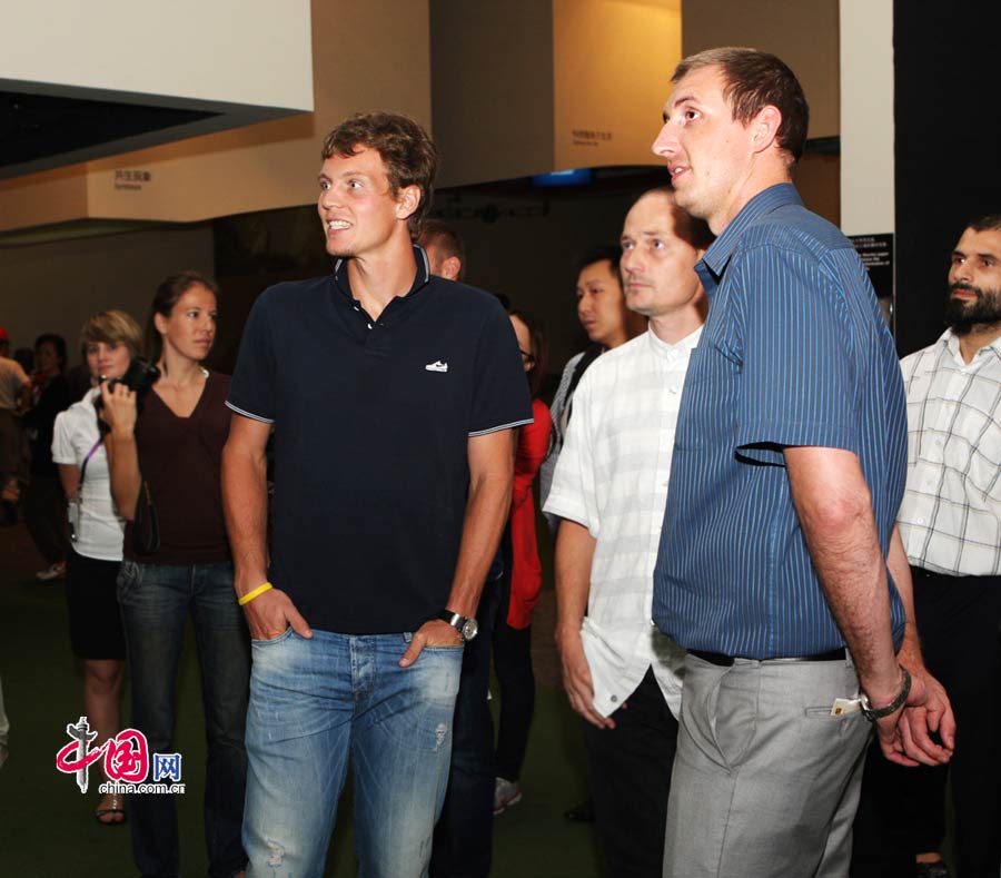 6 На фото: Томаш Бердых (слева на переднем плане) внимательно слушает рассказ сотрудника в Павильоне Чехии на ЭКСПО-2010 в Шанхае.