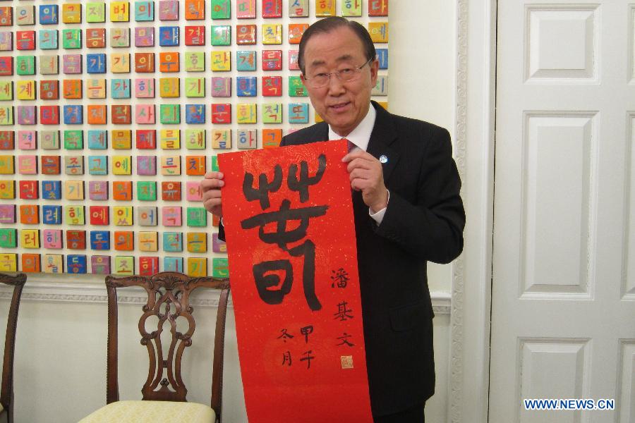 Нью-Йорк, 14 февраля /Синьхуа/ -- По просьбе Министерства культуры КНР генеральный секретарь ООН Пан Ги Мун вчера здесь написал иероглиф "весна" в честь предстоящего праздника Весны -- традиционного китайского праздника Весны, который будет отмечаться в этом году 19 февраля.