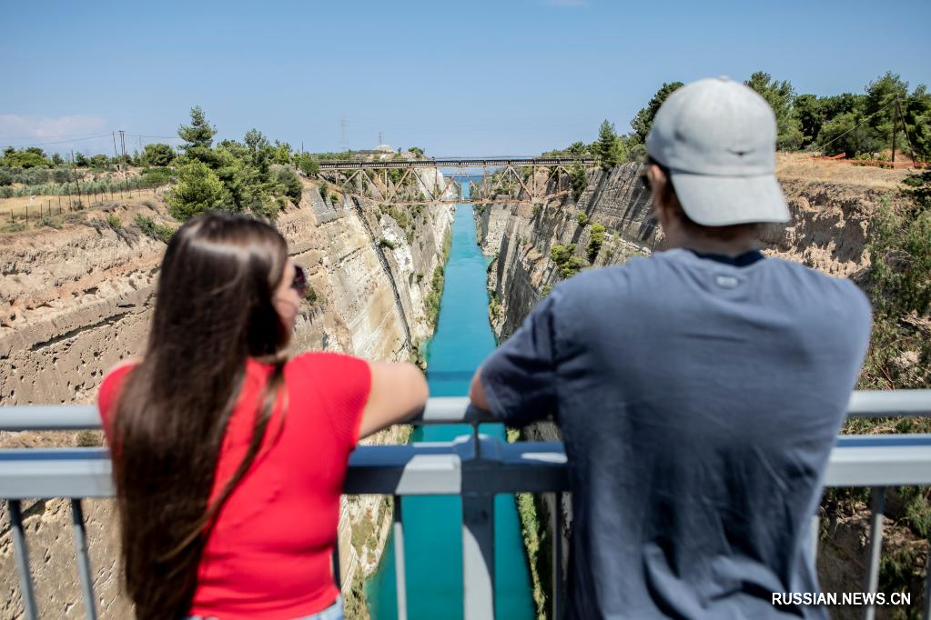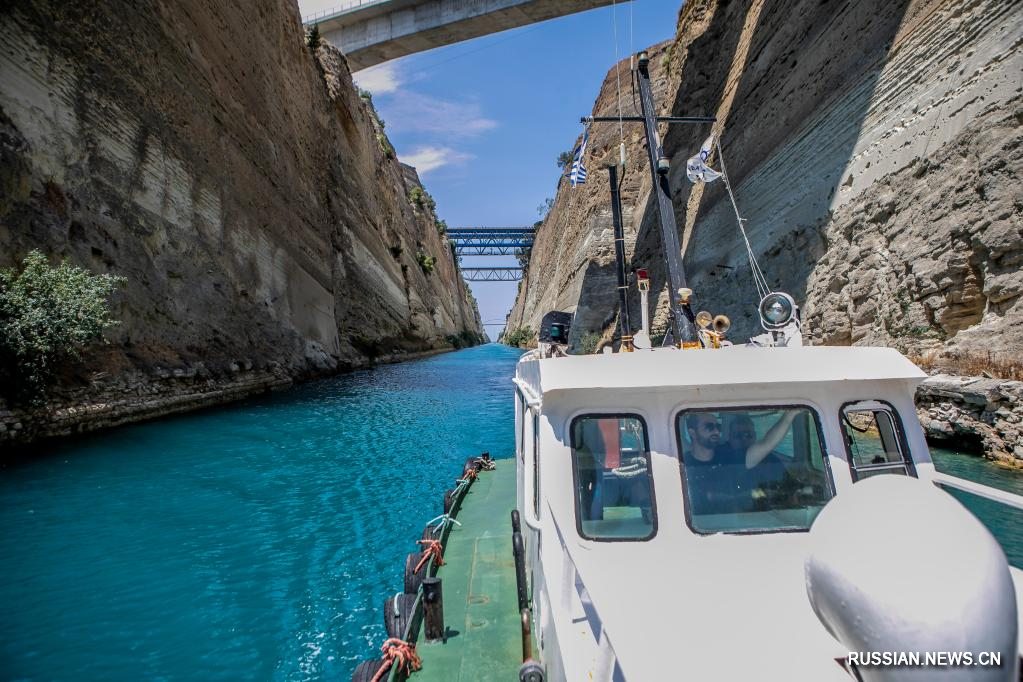 На фото от 11 июля 2022 года запечатлены пейзажи Коринфского канала в Греции. Знаменитый Коринфский канал в Греции вновь открылся для судоходства в начале этого месяца через полтора года из-за ремонтных работ после серии оползней. (Фото: Синьхуа)