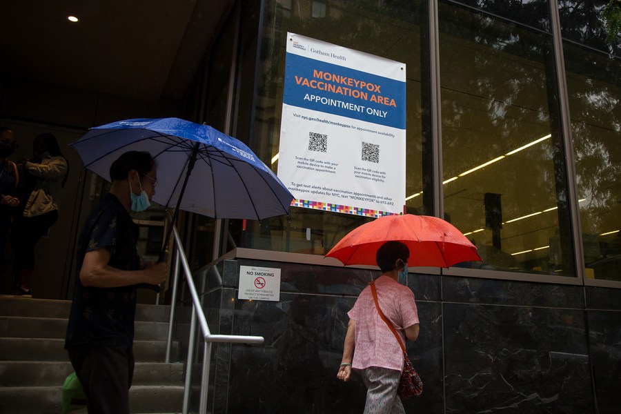 6 сентября, Нью-Йорк, США. Люди проходят мимо пункта вакцинации от оспы обезьян. /Фото: Синьхуа/
