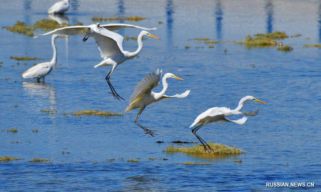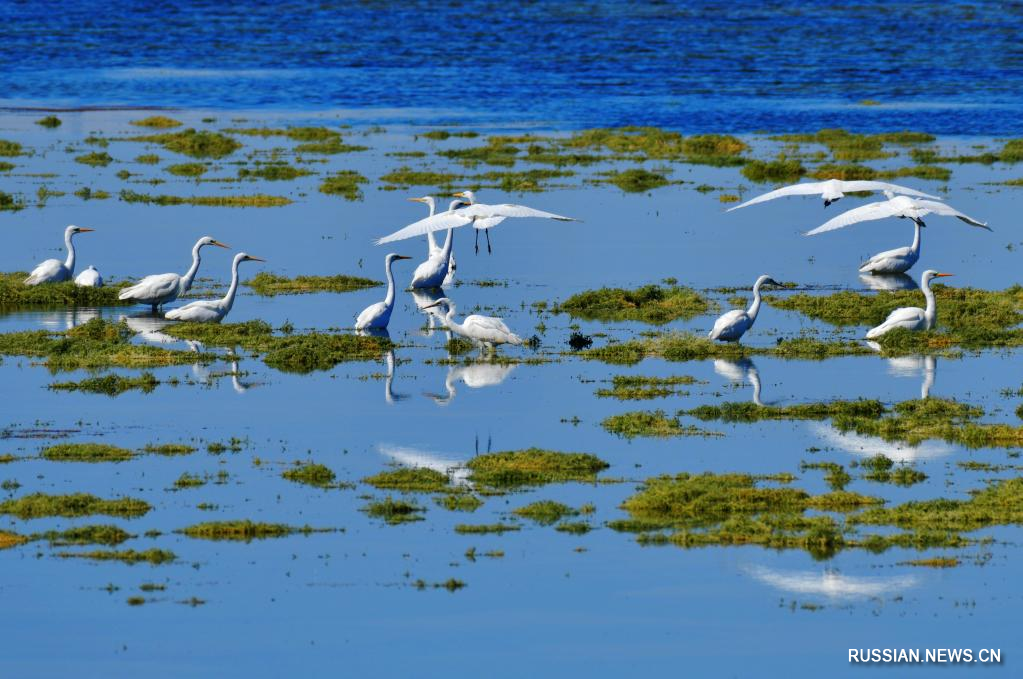 Аксай /пров. Ганьсу/, 10 октября /Синьхуа/ -- Осенью многочисленные белые цапли и другие дикие птицы резвятся и добывают пропитание в водохранилище Дунбула на территории Аксай-Казахского автономного уезда провинции Ганьсу на северо-западе Китая.