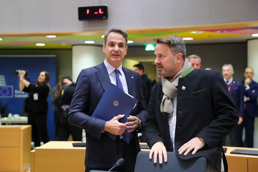 15 декабря, Брюссель. Премьер-министр Бельгии Александр Де Кроо /слева/ беседует с премьер-министром Люксембурга Ксавье Беттелем перед заседанием Европейского Совета. /Фото: Синьхуа/