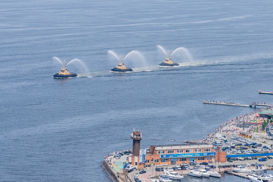 30 июля, Владивосток, Россия. Три буксира принимают участие в праздничном шоу в День ВМФ. /Фото: Синьхуа/