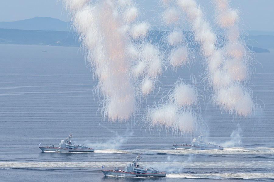 30 июля, Владивосток, Россия. Военные корабли запускают салют в День ВМФ. /Фото: Синьхуа/