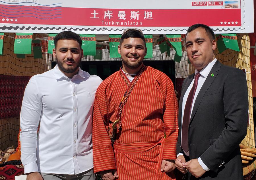 1 октября 2023 года, Рахман Байрамдурдыев /1-й справа/ и другие студенты перед стендом Туркменистана на 7-м международном культурном фестивале Китайского нефтяного университета /Пекин/. /Фото: Синьхуа/