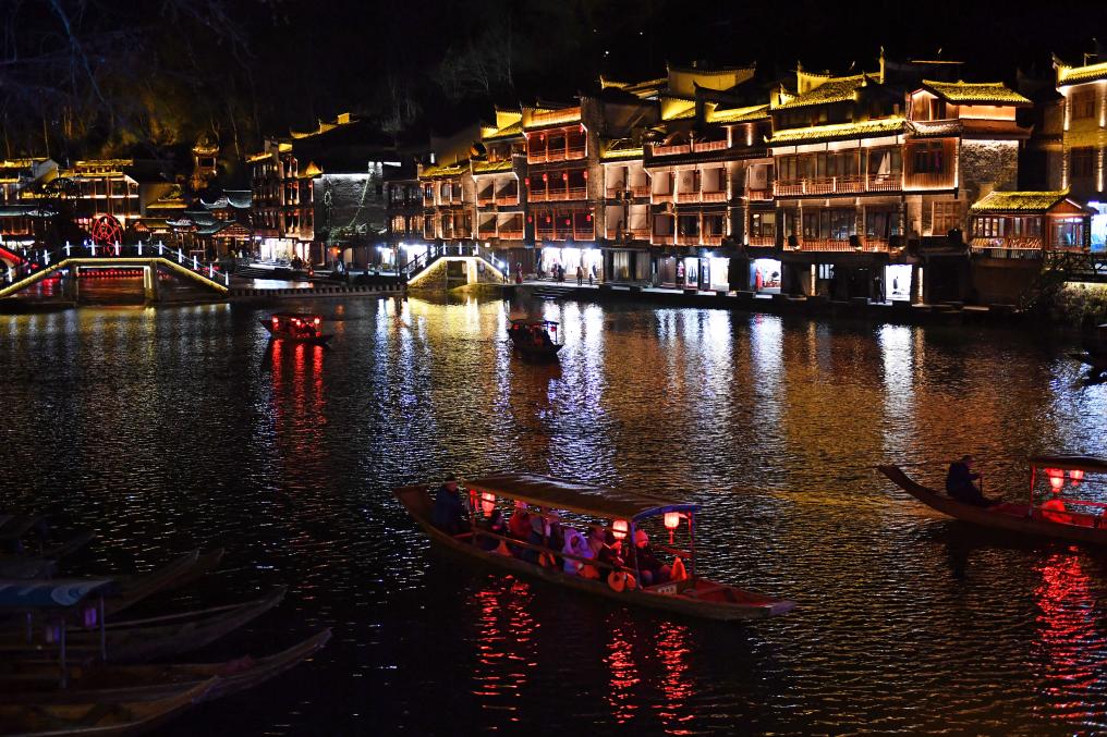 Фэнхуан /пров. Хунань/, 2 февраля /Синьхуа/ -- Ночной вид на древний городок Фэнхуан в Сянси-Туцзя-Мяоском автономном округе /пров. Хунань, Центральный Китай/ привлекает множество туристов, которые приезжают сюда ради неповторимого очарования "ночного Фэнхуана". -0-