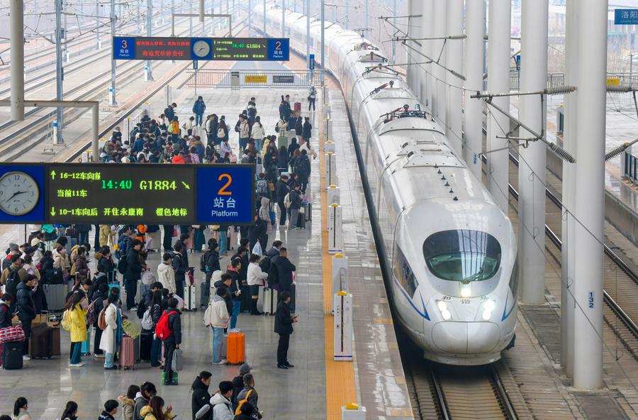 22 февраля 2025 года, пассажиры готовятся к посадке на поезд на железнодорожном вокзале Лоян Лунмэнь в городе Лоян провинции Хэнань /Центральный Китай/. /Фото: Синьхуа/