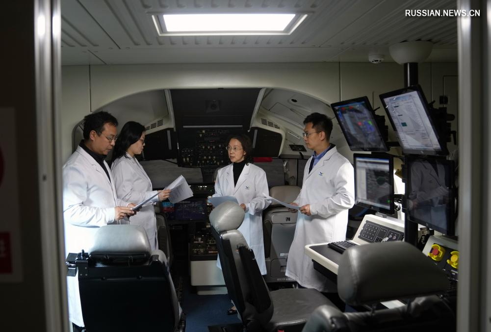 5 марта 2025 года, Чжао Чуньлин /вторая справа/ вместе с коллегами в авиасимуляторе C919 в исследовательском институте Китайской корпорации коммерческих самолетов /COMAC/ в Шанхае /Восточный Китай/.