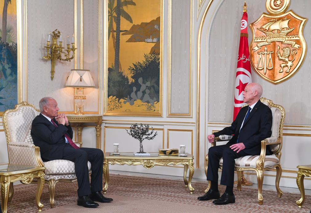 15 апреля, Тунис. Президент Туниса Каис Саид /справа/ на встрече с генеральным секретарем Лиги арабских государств /ЛАГ/ Ахмедом Абу аль-Гейтом. /Фото: Канцелярия президента Туниса/Синьхуа/