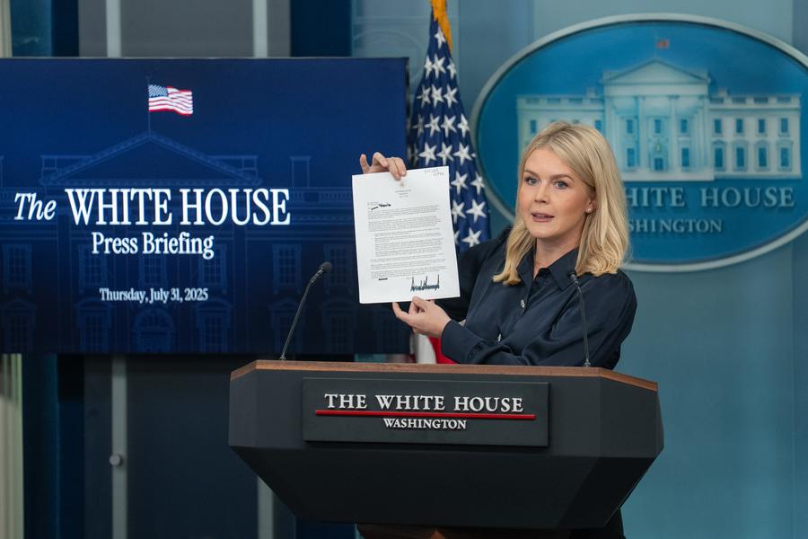 31 июля, Вашингтон. Пресс-секретарь Белого дома Кэролайн Ливитт демонстрирует письмо президента США Дональда Трампа на пресс-брифинге в Белом доме. /Фото: Синьхуа/