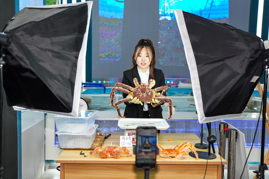 В торгово-выставочном зале королевских крабов, расположенном в Индустриальном парке трансграничной электронной коммерции региона Северо-Восточной Азии в г. Хуньчунь, сотни синих и красных королевских крабов из Берингова пролива комфортно обитают в огромном бассейне.