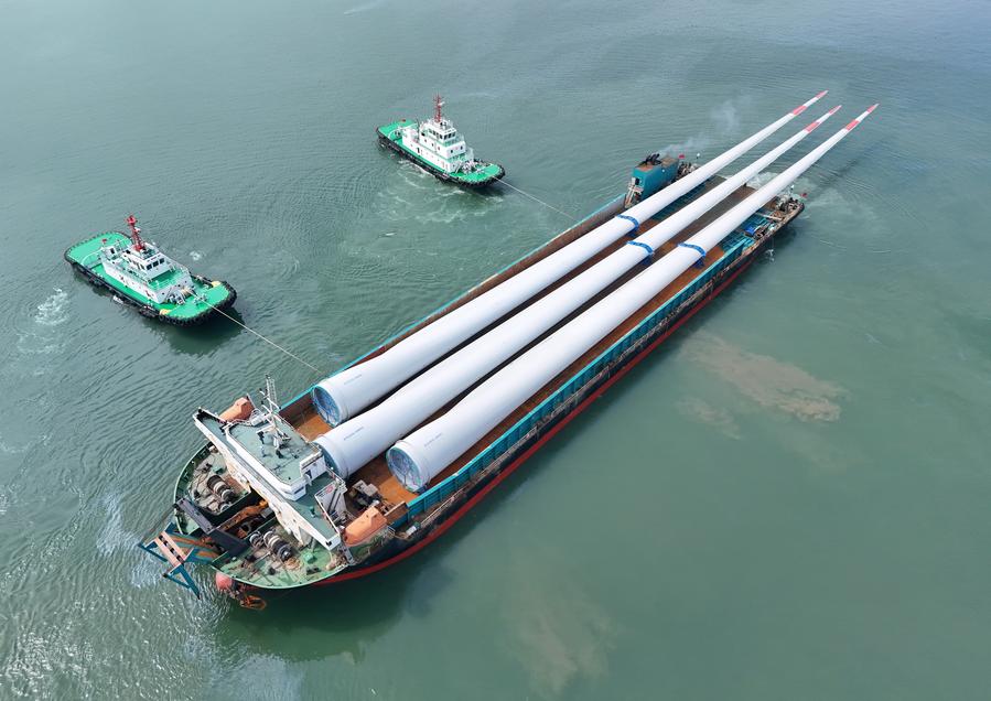 1 августа 2025 года, лопасти ВЭС, перевозимые на судне, в портовой зоне Пэнлай порта Яньтай /пров. Шаньдун, Восточный Китай/. /Фото: Синьхуа/