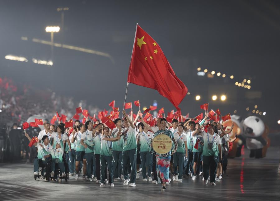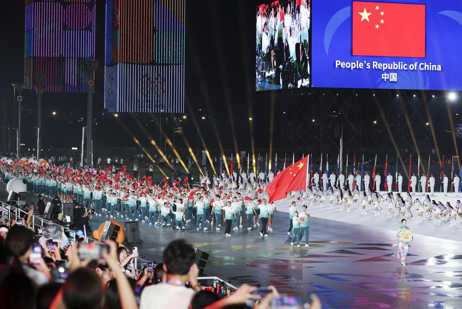 7 августа 2025 года, члены сборной Китая проходят во время парада участников на церемонии открытия Всемирных игр-2025 в Чэнду /пров. Сычуань, Юго-Западный Китай/. /Фото: Синьхуа/