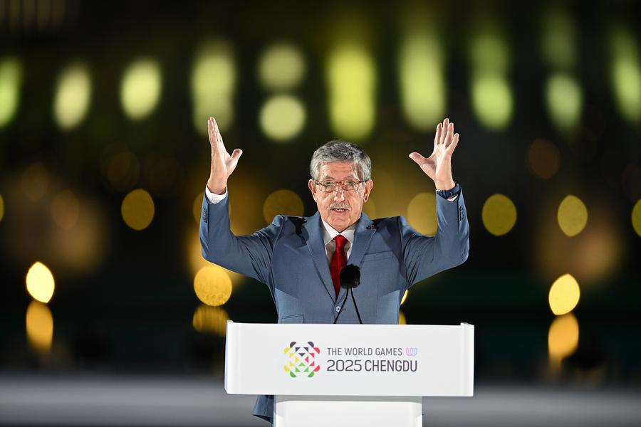 7 августа 2025 года, президент Международной ассоциации всемирных игр /IWGA/ Хосе Перурена Лопес выступает с речью на церемонии открытия Всемирных игр-2025 в Чэнду /пров. Сычуань, Юго-Западный Китай/. /Фото: Синьхуа/