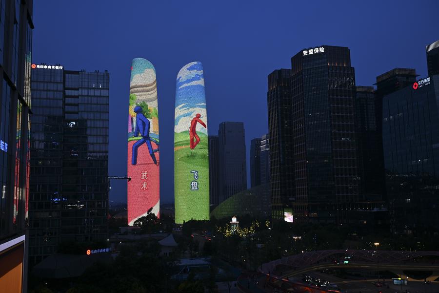На фото от 7 августа 2025 года запечатлен ночной вид на башни-близнецы Финансового города Чэнду в день церемонии открытия Всемирных игр-2025 в Чэнду /пров. Сычуань, Юго-Западный Китай/. /Фото: Синьхуа/