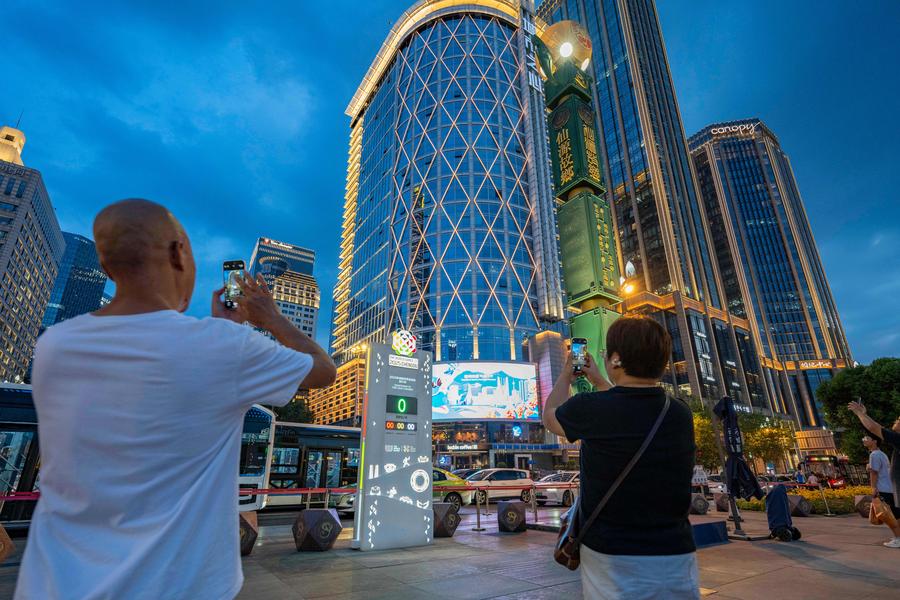 7 августа 2025 года, люди фотографируют часы с обратным отсчетом на площади "Тяньфу" перед началом церемонии открытия Всемирных игр-2025 в Чэнду /пров. Сычуань, Юго-Западный Китай/. /Фото: Синьхуа/